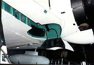 着陸接地の瞬間 スプリットフラップを全開させ、翼弦方向の長さは、変わらず翼面積は変わらないものの、キャンバーを大きくとることにより、失速角度を大きくとれるので、機体速度を目一杯落すことができる。 また、主輪のオレオも荷重が掛かっていないので、ずいぶんと伸び切っているのがわかる。また、上の離陸した後の画像では、上昇角を一定にするため、既にエレベーターは、ニュートラルに戻り、フラップは、使用していない。 |