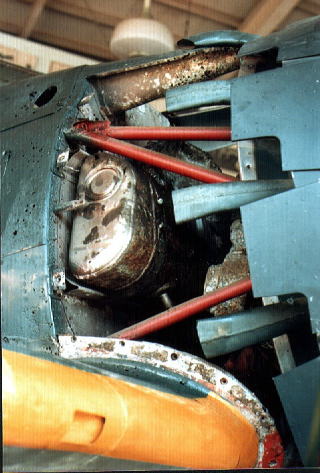 エンジンとマウント取り付け部 前方より、カウリングの取り付けは、右斜上と左斜下にあり