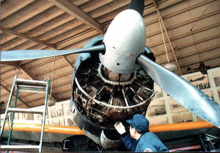 翼フィレット付近に立つ、胴体(キャノピー後方)には、整備用 取り降ろされた誉エンジンと共に